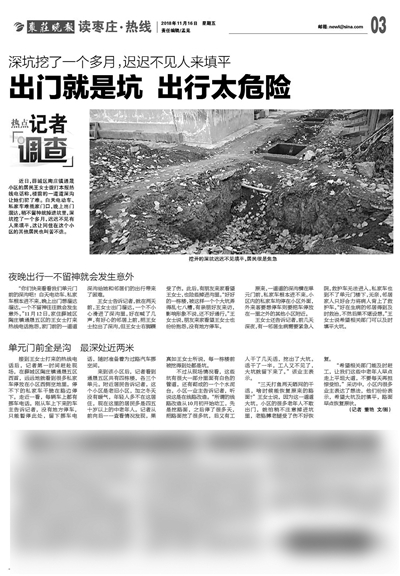 去年11月16日,本报报道了薛城区陶庄镇通晟小区楼前一个个深坑让业主出行受阻一事。6月23日,记者在该小区发现,深坑被填平了,居民楼下的路面变成了柏油路。