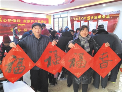 近日,市中区齐村镇新时代文明实践中心,组织9位书画志愿者来到齐东村,现场书写春联,将新春的祝福送到社区居民的手中。