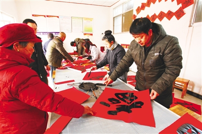 4日,由市残疾人书画家协会组织的“把福送给你”书画小分队,来到大运河之畔的峄城区古邵镇孝一村,为这里的乡亲义务写春联。 (记者 孔浩 摄)