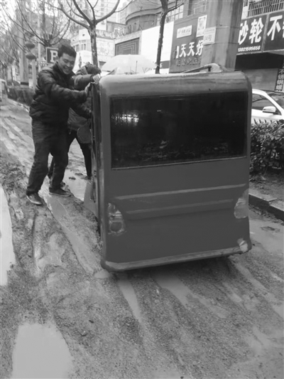 7日,在市中区中天步行街,一辆电动三轮车不幸泥泞,几位陌生路人冒雨将三轮车推出。 (记者 王正 摄)